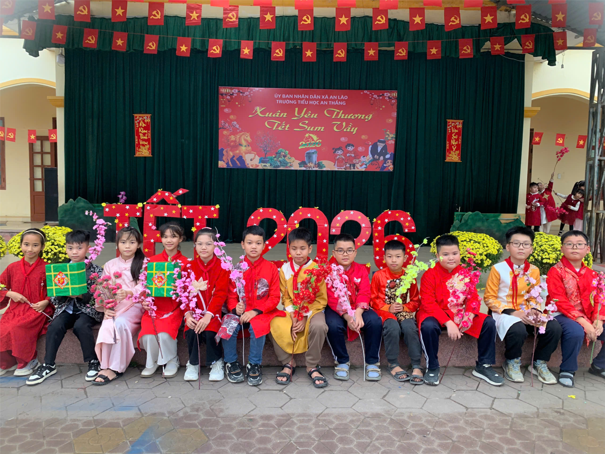 Trong sắc xuân ngập tràn nắng mới, lớp 5C bỗng trở nên thật đặc biệt khi các bạn cùng khoác lên mình những bộ áo dài Tết rực rỡ. Tà áo tung bay nhẹ nhàng trong gió, sắc đỏ, sắc vàng, sắc xanh hòa vào nhau như một vườn hoa mùa xuân đang nở rộ giữa sân trường.