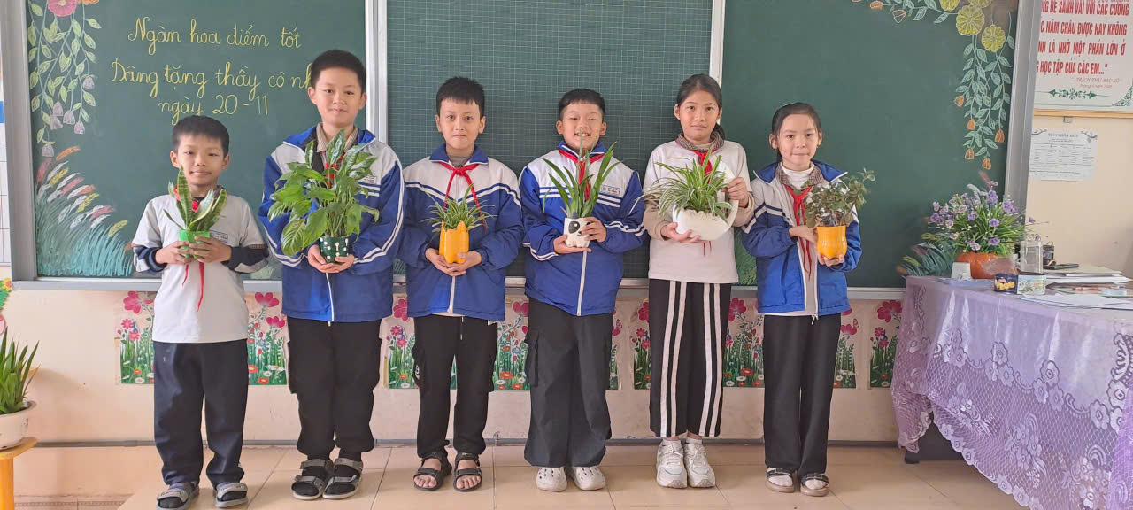 ✨ Thực hiện phong trào “Xây dựng trường học xanh – sạch – đẹp – an toàn” và hướng tới chào mừng ngày Nhà giáo Việt Nam 20/11, các em học sinh lớp 4A đã cùng nhau tổ chức hoạt động trồng và chăm sóc cây xanh trong lớp học. 🍂 🌻 Dưới sự hướng dẫn của cô giáo chủ nhiệm, các em đã mang đến nhiều loại cây cảnh nhỏ như trầu bà, xương rồng, sen đá, cây lưỡi hổ, lan ý… để đặt ở góc học tập, bệ cửa sổ và bàn giáo viên. Mỗi nhóm học sinh phụ trách một chậu cây, luân phiên chăm sóc, tưới nước và lau lá mỗi ngày. 🌷