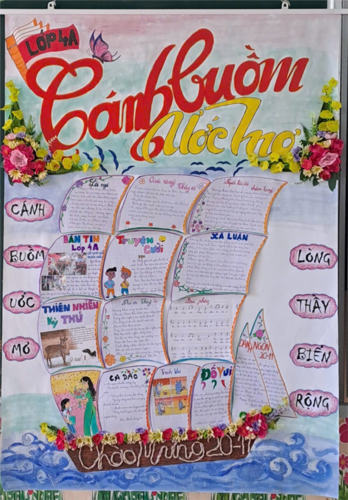 🌼 Tờ báo tường của lớp 4A mang chủ đề “Cánh buồm ước mơ”, bao gồm nhiều bài viết chân thành, trong trẻo: những vần thơ mộc mạc gửi tặng thầy cô, những câu chuyện nhỏ nhưng ý nghĩa về tình bạn – tình thầy trò, cùng nhiều tranh vẽ thể hiện ước mơ và cảm xúc của học sinh. Các sản phẩm đều được đầu tư công phu, thể hiện sự chăm chỉ và tình cảm của các em. 🌹