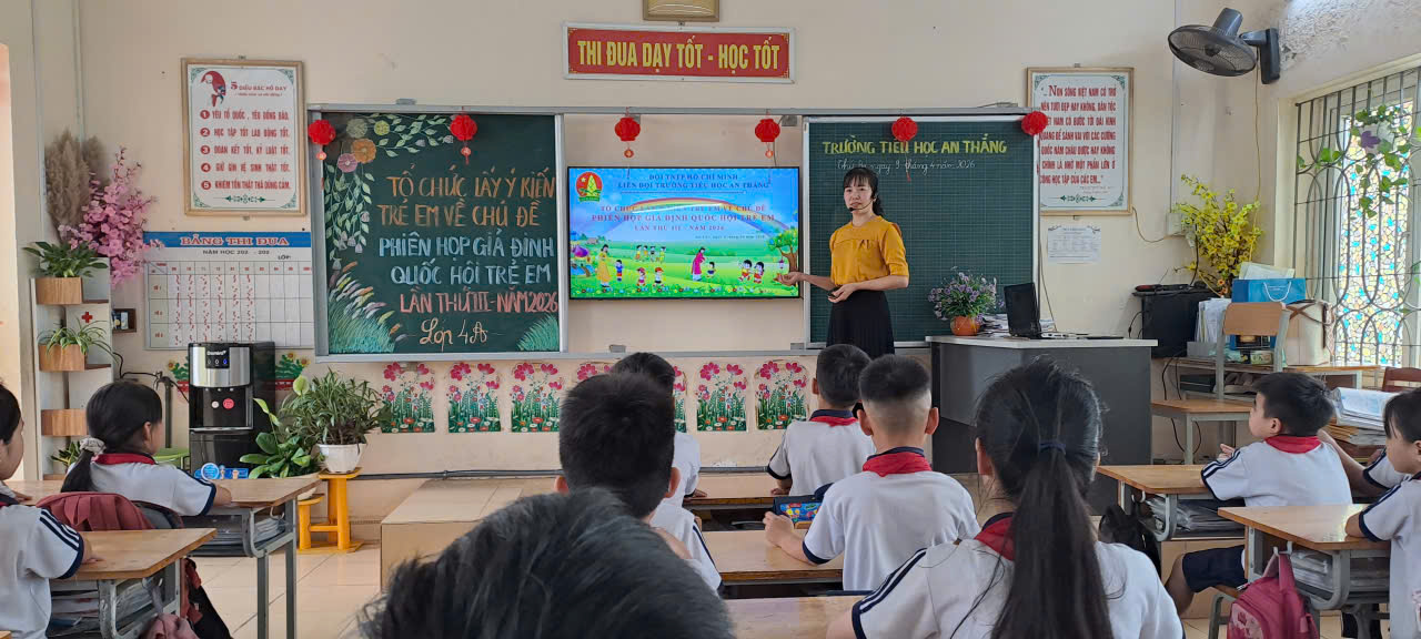 🍁 Nhằm tạo điều kiện để học sinh được bày tỏ suy nghĩ, nguyện vọng của mình đối với các vấn đề liên quan đến trẻ em, lớp 4A đã tổ chức hoạt động tuyên truyền về việc lấy ý kiến trẻ em cho Phiên họp giả định Quốc hội trẻ em lần III năm 2026. Hoạt động diễn ra trong không khí sôi nổi, hào hứng với sự tham gia đầy đủ của các em học sinh trong lớp.