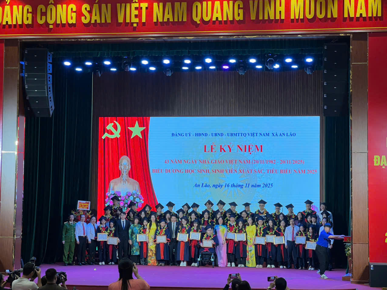 🌸Dự lễ kỷ niệm có đồng chí Nguyễn Cao Lân – Thành ủy viên, Phó Trưởng ban Thường trực Ban Tuyên giáo & Dân vận Thành ủy ; đồng chí Nguyễn Tiến Mạnh – Phó Bí thư Thành đoàn; đồng chí Trần Thu Hằng – Trưởng phòng Giáo dục mầm non và Giáo dục tiểu học, Sở GD&ĐT TP; các đồng chí lãnh đạo Đảng ủy – HĐND – UBND – UBMTTQVN xã, nguyên lãnh đạo huyện An Lão là nhà giáo, các nhà giáo ưu tú trên địa bàn; đại diện các phòng ban, ngành, đoàn thể, doanh nghiệp, trường học, lãnh đạo thôn, các thầy cô giáo nhận bằng khen và 57 học sinh sinh viên xuất sắc tiêu biểu trên địa bàn.